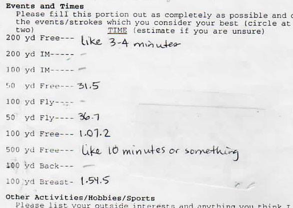 This was my high school swim team sign-up sheet. If you do the math, you can see my estimates for the distance events (200 & 500 yard swim) were pretty unambitious ...