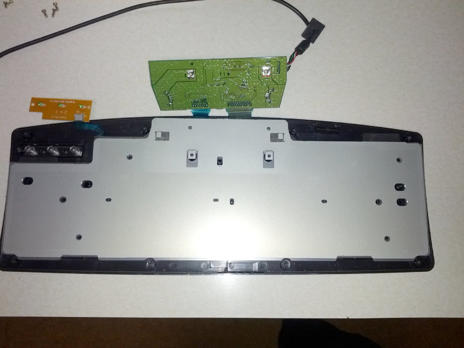 Then carefully remount the plastic circuit trace sheet and metal bottom plate, aligning them on the plastic guide posts.