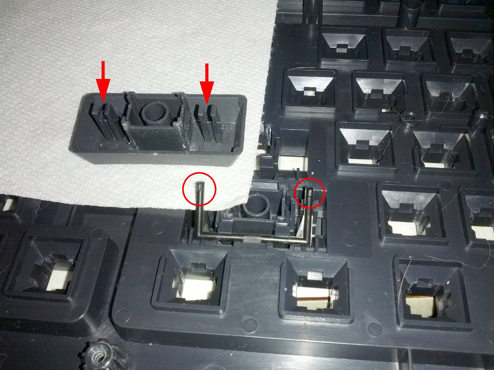 Longer keys, such as the Spacebar and/or Shift keys, may have a metal or (as in this case) plastic stabilizer clip.