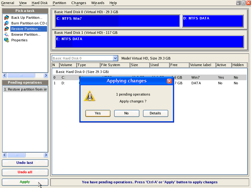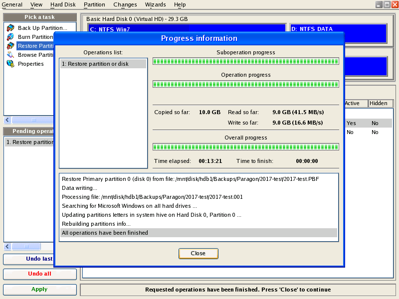 When the restore process is complete, the dialog box will report, "All operations have been finished".