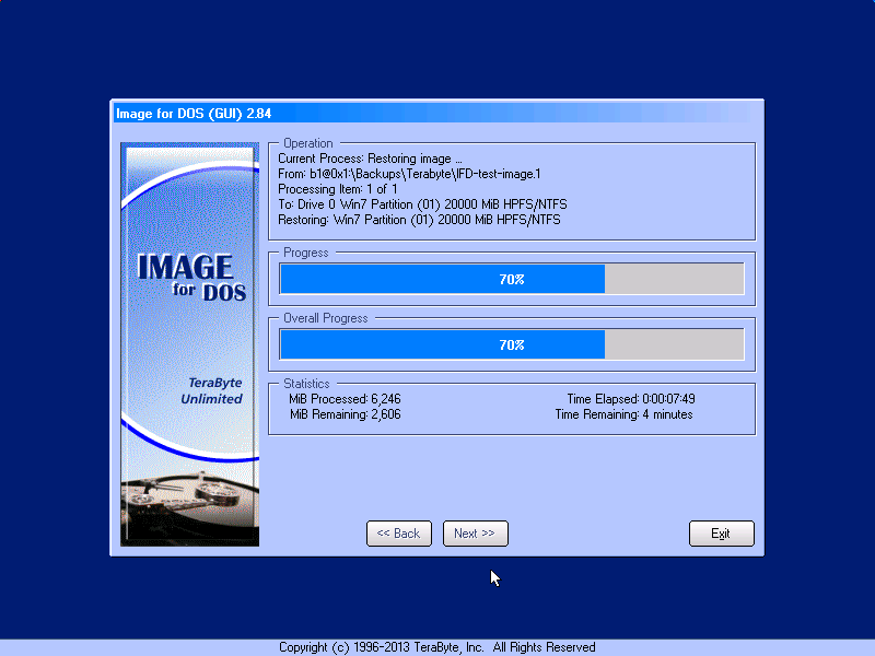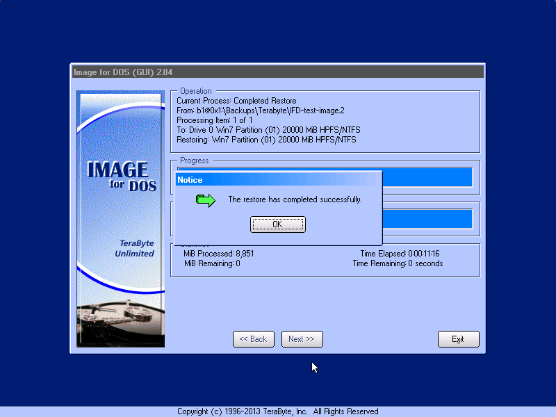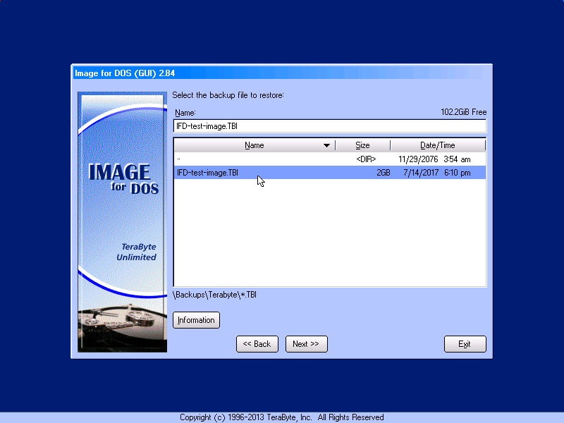 In this example, the backup image is \Backups\Terabyte\IFD-test-image.TBI in the DATA partition on Hard disk 1.